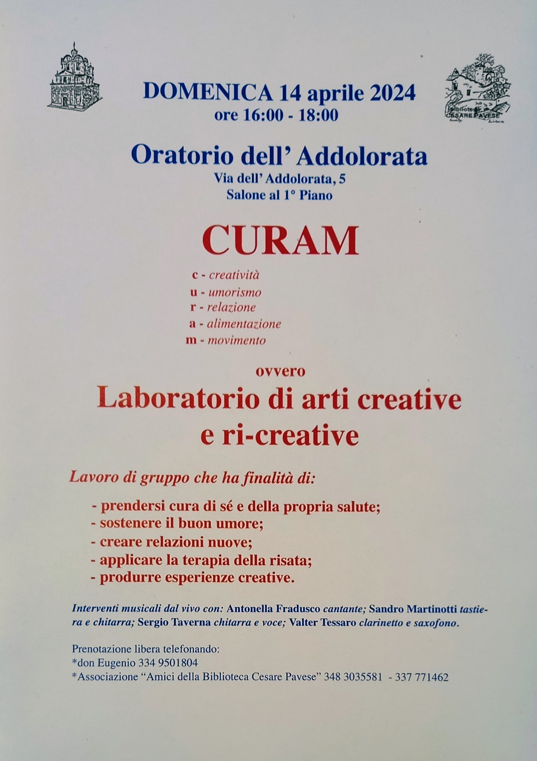 * CURAM (creatività, umorismo, relazione, alimentazione, movimento): laboratorio di arti creative e ri-creative promosso con l'associazione Amici della Biblioteca "Cesare Pavese", domenica 14 aprile dalle ore 16:00 alle ore 18:00 in Oratorio. Iniziativa aperta a tutti.